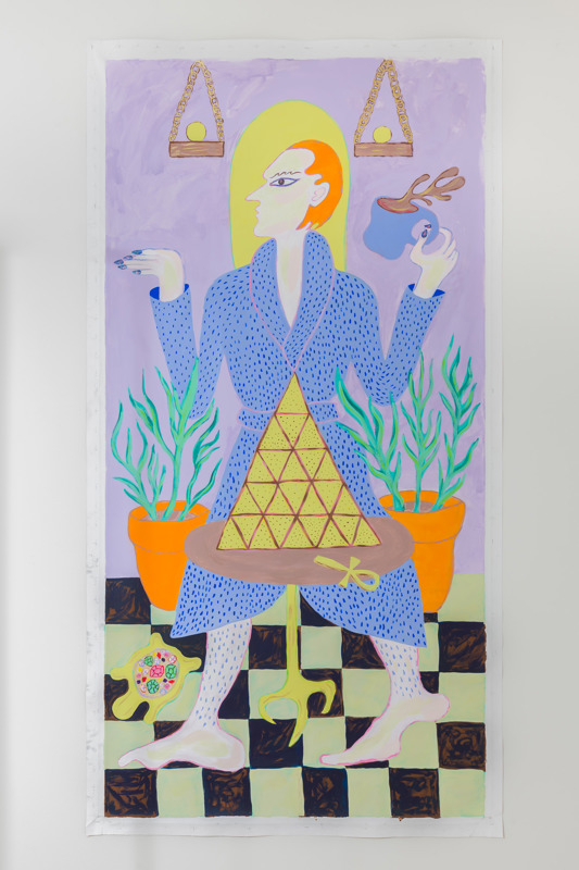 Det er torsdag kveld på Astrup Fearnley Museet og duket for Artist Talk. Tilskuerne går over en bro og inn i et forrom dekket av en tapet i et repeterende mønster som ligner speilegg. Her kan man ta av seg på bena og få på seg tøfler før man trer inn i hovedrommet der det henger et enormt rødt vevarbeid fra taket, med gule soler og lilla måner. På veggene henger malerier i sterke farger og atskillige tankekart fra prosessen. Gulvet er belagt med et mykt, hvitt teppe.